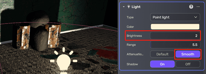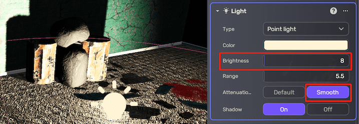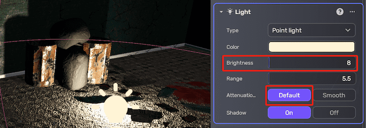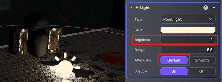 The Default attenuation mode is suitable for most lighting scenarios. However, the Smooth attenuation mode is a better choice when the light needs to maintain its penetration, such as in the case of flashlights or high-beam car headlights. Note that when using the Smooth attenuation mode to achieve the same lighting effect at greater distances, a lower brightness value may be required, while simultaneously avoiding overexposure in closer areas.