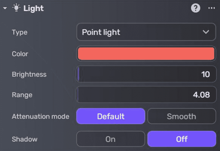 | Brightness | The intensity or strength of the point light's light. Ranges from 0 to 1000. Default: 1. |