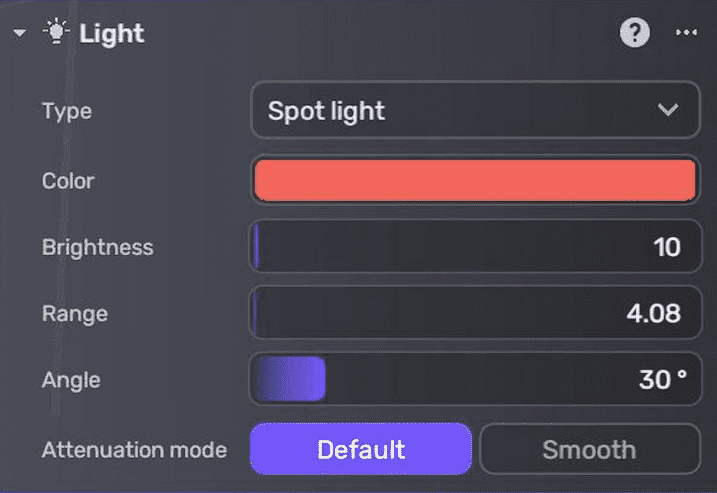 | Attenuation mode | Determines how the light intensity is calculated for each point within the lighting range. For most lighting scenarios, select Default. If you want to maintain the light's penetration, choose Smooth. This option is only visible when Type is set to Spot Light or Point Light. For more information, see Light attenuation. |