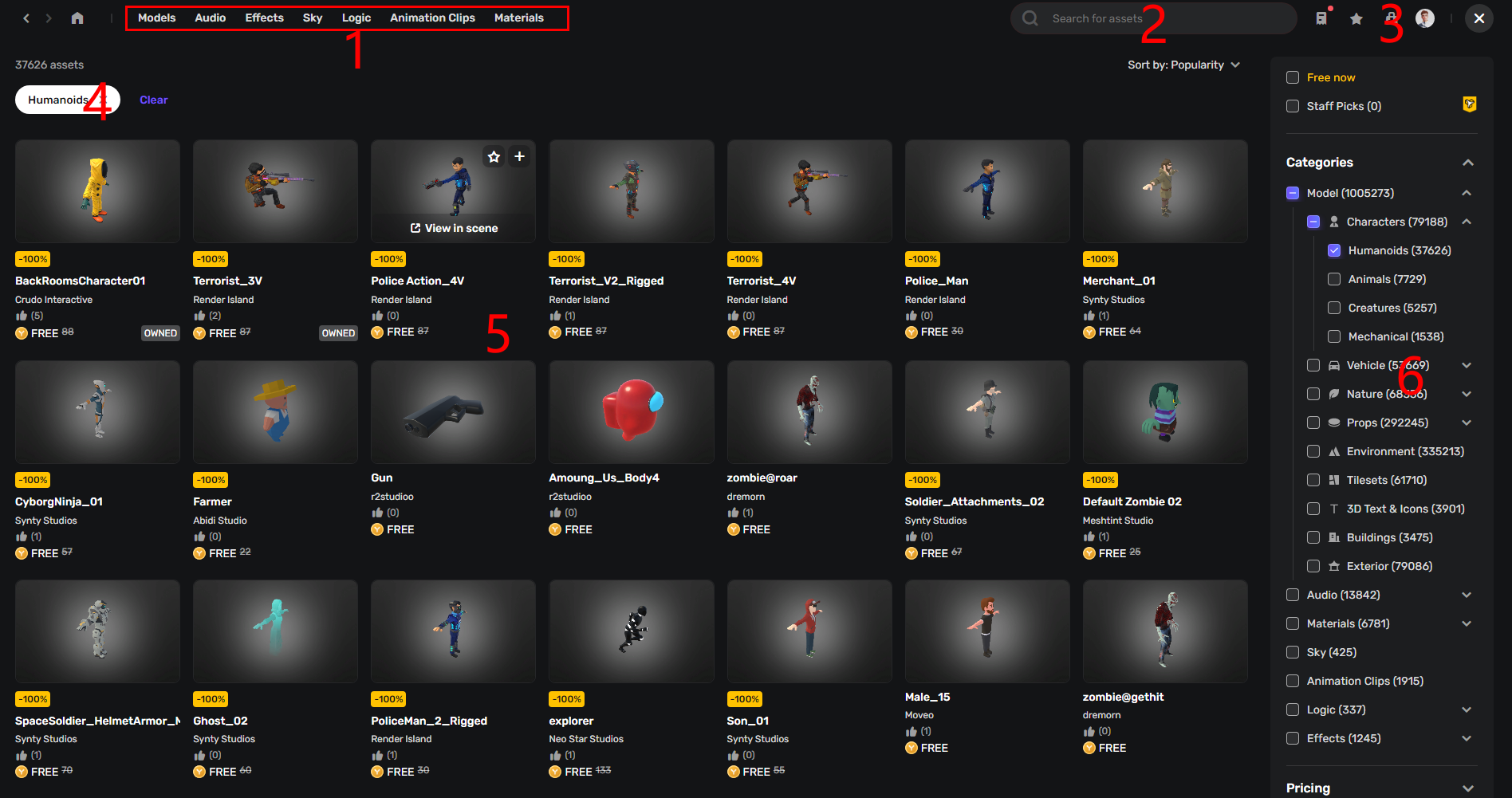 (4) Search keywords and filters for narrowing down assets (5) The assets sorted out by the search keywords and filters (6) The filter sidebar for you to select filters from