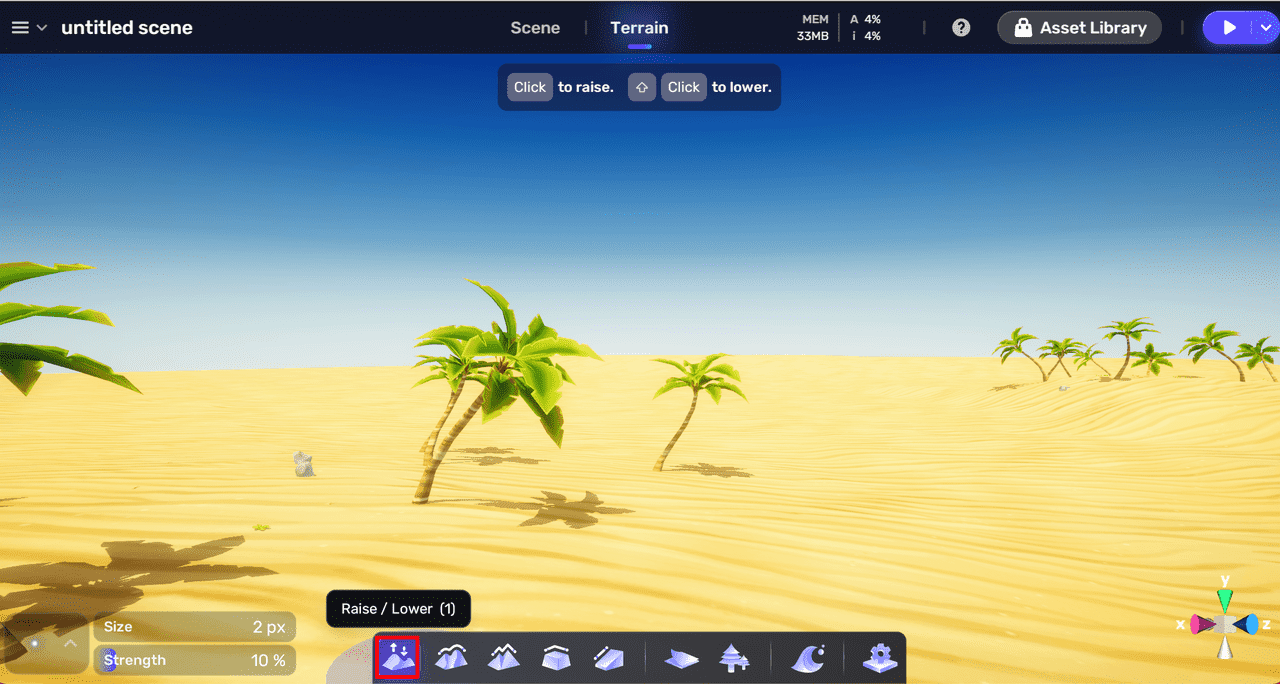 Activate the Raise/Lower terrain tool by choosing the first icon at the bottom.