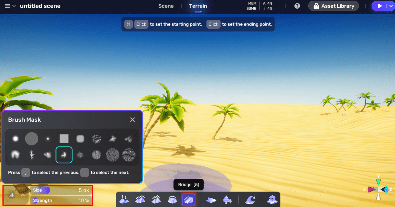 Activate the Bridge terrain tool by choosing the fifth icon at the bottom.