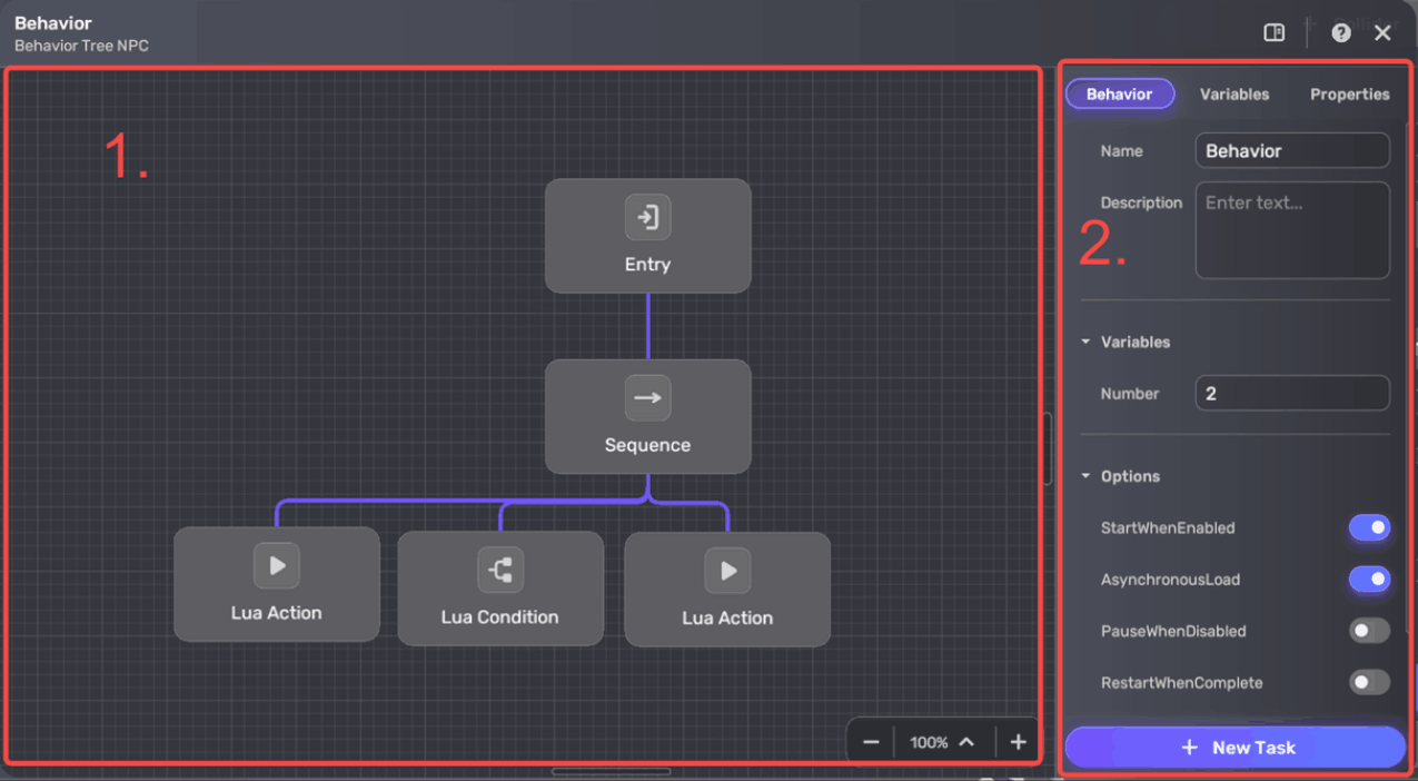 This area displays the entire behavior tree. Each grey rectangle is a node (or a task) which undertakes a specific operation. The nodes are connected by the purple lines which indicate their relationships. Use the scroll bars at the bottom and right to move the canvas.