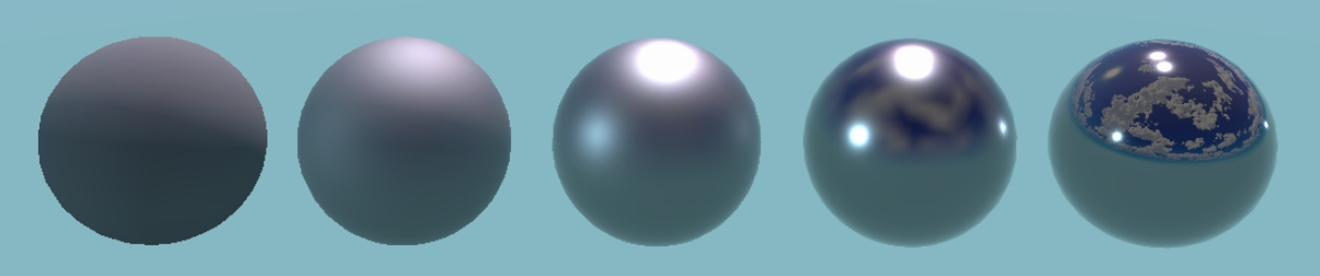 属性 说明 颜色(Color) 漫反射贴图的 RGB 颜色 贴合方式(Fit) 决定图片如何覆盖物体,可平铺或拉伸。平铺:多次复制图片覆盖物体。拉伸:拉伸或压缩图片以适应物体。 平铺次数(Tiling) 仅在贴合方式为 拉伸 时可用,决定贴图在 x、y 轴上的重复次数。 偏移(Offset) 仅在贴合方式为 拉伸 时可用,决定贴图在 x、y 轴上的偏移,实现错位或居中效果。 渲染面(Render face) 网格渲染的面:正面、背面或双面 表面类型(Surface type) 表面材质类型,影响光的反射方式。不透明:完全实心表面。透明:完全半透明表面。 PBR 工作流(PBR workflow) 采用基于物理的渲染(PBR)方法,考虑材质物理属性:金属:材质呈金属质感,基础色控制高光颜色,大部分光以高光反射。高光:高光反射与入射光同色,正面观察时几乎不反射。 光滑度(Smoothness) 决定光与表面交互方式,影响反射效果。范围 0~1,值越高越光滑、镜面感更强,反射更锐利;值低则更漫反射 、哑光。下图展示光滑度从 0(左)到 1(右)的效果: