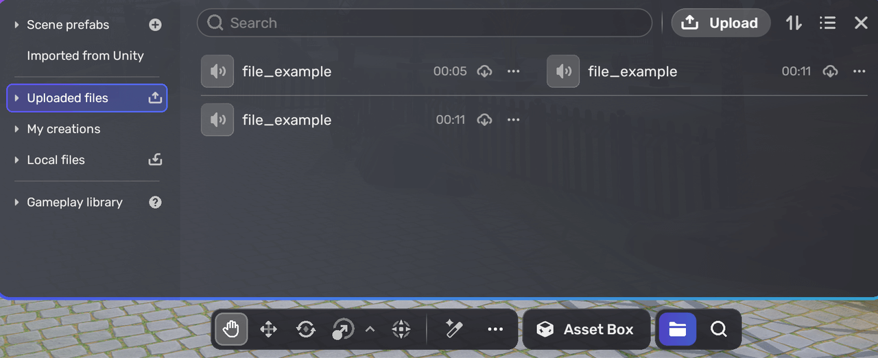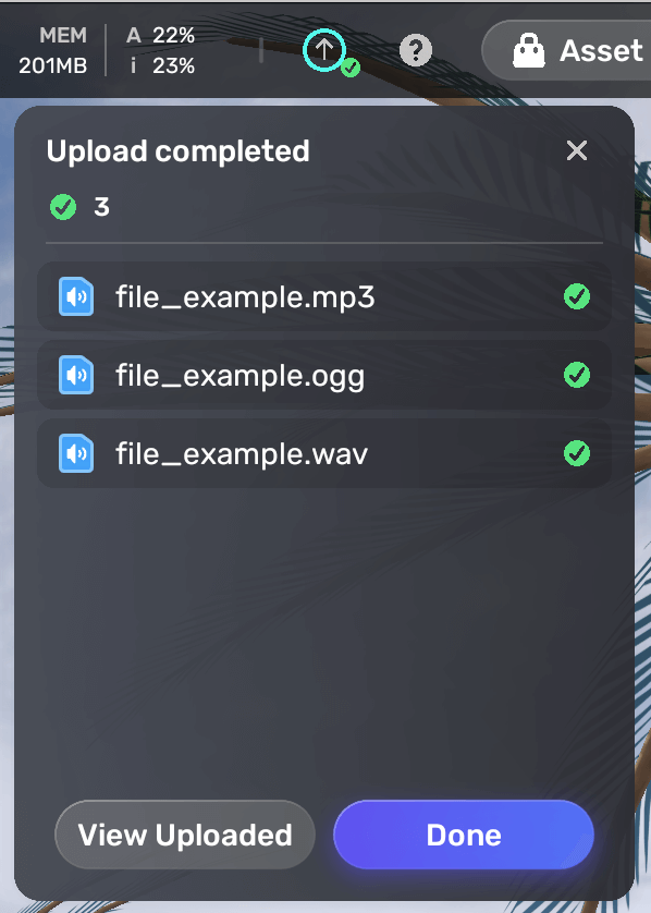 点击 已上传文件 下拉列表,选择 音频。可点击中间或右上角的 上传 按钮。