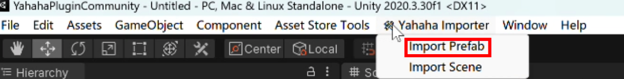 在顶部菜单选择 Yahaha Importer > Import Prefab 打开 Yahaha 资产导入器。