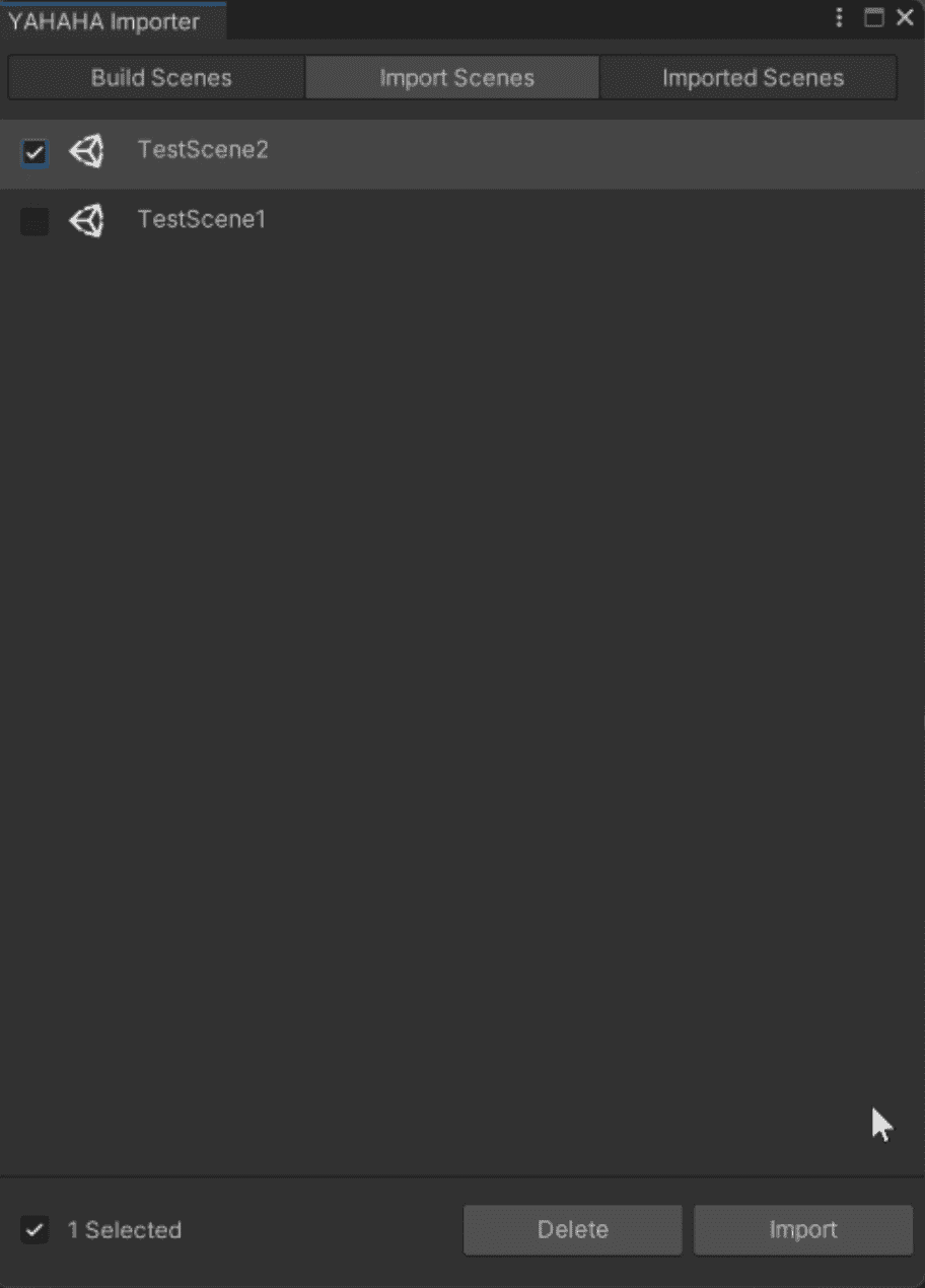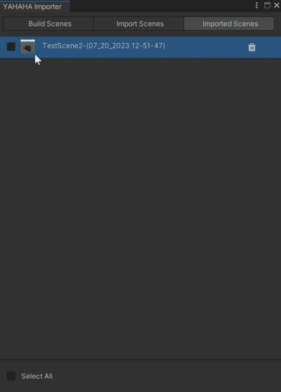 在 Imported Scenes 标签页可查看和删除已导入场景。删除时选中或悬停后点击删除按钮,场景会自动从 YAHAHA 移除。