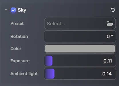 天空 (Sky) 面板可设置天空盒,决定场景的视觉背景。关闭后,天空呈现为蓝色。重置面板将恢复默认设置和预设。