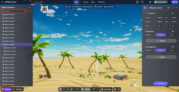 Studio界面场景编辑器主要窗口资源管理器窗口版本:1.0.0本页总览资源管理器窗口 资源管理器 (Object Explorer) 用于查找当前场景中所有 Yahaha 对象。点击 打开 资源管理器窗口。 查找 Yahaha 对象 你可以在搜索框输入关键词定位特定 Yahaha 对象,或直接浏览资源管理器。 组织 Yahaha 对象 为便于管理,可将 Yahaha 对象层级归类。将子 Yahaha 对象拖入父 Yahaha 对象下即可建立父子关系。