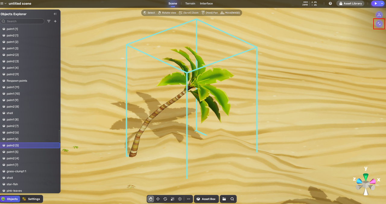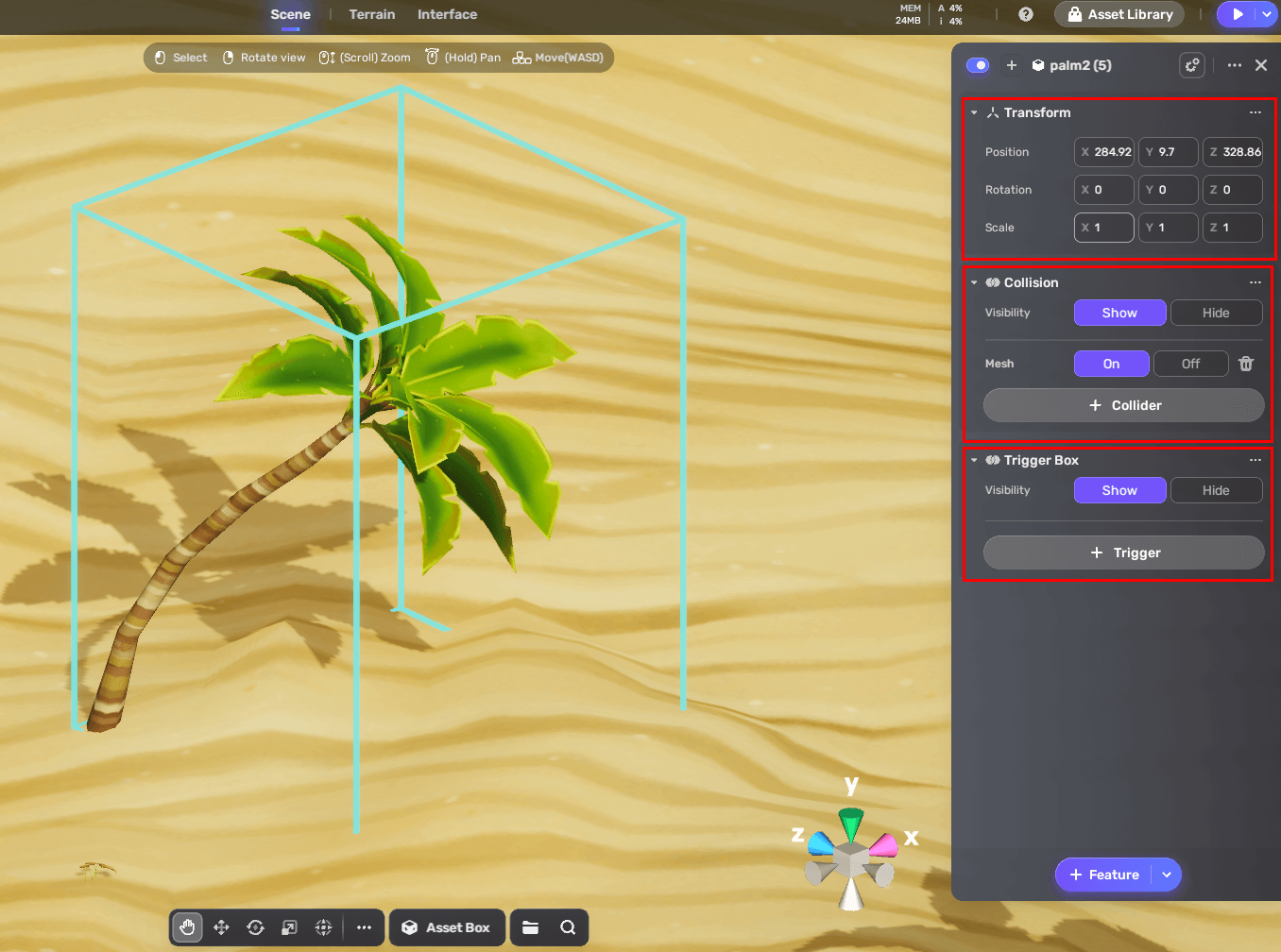 你可以查看和编辑场景属性,如 变换、碰撞体 和 触发盒。